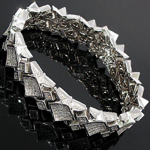 This one of a kind mens bracelet is adorned with brilliant princess and round cut diamonds. The frame is crafted in 14K White Gold and measure to 8 3/4 Inches in length. It securely locks with a slide in clasp and two safety latches from opposite sides. This is an ideal diamond mens accessory for a special night out.Available at Amazon